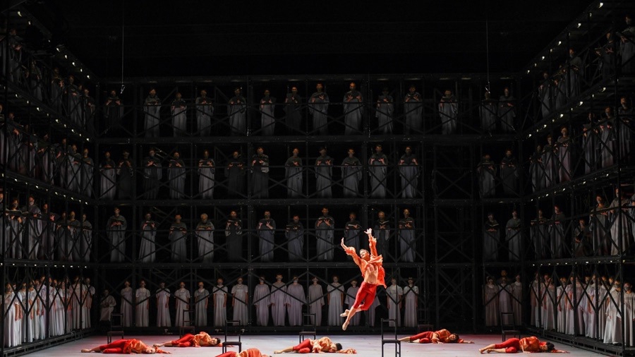 这种力量的滚动,也体刻下舞台空间的构建上。香港管弦乐团驻团指点廖国敏提到,《终末的歌》中,乐团成员走上舞台,与舞者共同饰演;《布兰诗歌》中,九米高的环绕式高台营造出修说念院的内景,上百位歌咏家立于其上,与台下乐团变确立体呼应。卫承天兼任背景蓄意,他形色空中吊挂的轮盘“既呼应《哦,幸运》里的‘幸运之轮’,也像主角奥兰多一世追赶的、驴年马月的‘天神’”。